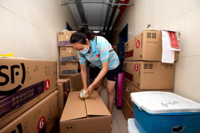 北京體育大學(xué)輔導(dǎo)員高強介紹,所有教職員工每天從早上8點多忙碌到晚上6點多。 男生一般需要打包5個行李箱,女生的東西更多,有的需要打包十幾個紙箱?!耙驗橐獮槊總€同學(xué)‘直播’行李打包過程,學(xué)校教職員工隨時帶著充電寶,保障手機‘不斷電’。”
