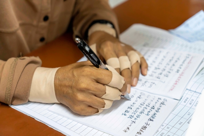 張桂梅在辦公室里填寫教學樓巡查記錄(7月4日攝)。