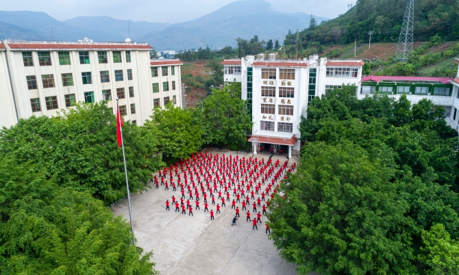 ↑云南麗江華坪女子高級中學學生在做課間操(7月4日攝)。