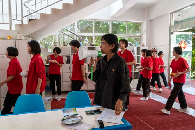 ↑張桂梅在食堂催促學生吃中飯(7月4日攝)。