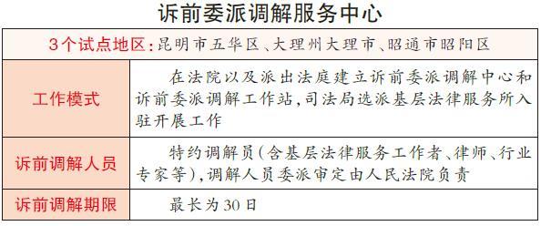 省司法廳人民參與和促進法治處處長孫躍文告訴記者,今年以來,為完善我省矛盾糾紛多元化解機制,破解基層訴前矛盾糾紛解決難題,省司法廳分別對昆明市中級人民法院和全省34個縣(市、區(qū))的3個基層人民法院、58個司法所、70個基層法律服務所開展實地調(diào)研。經(jīng)多次會商討論,明確在昆明市五華區(qū)、大理州大理市、昭通市昭陽區(qū)開展基層法律服務參與訴前委派調(diào)解試點工作。