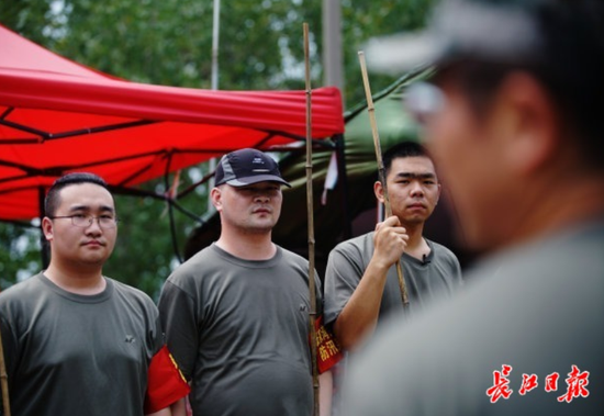 11日下午,武漢武金堤張家灣街駐守堤段,8名青年突擊隊(duì)隊(duì)員手拿長(zhǎng)竿站成一排,正準(zhǔn)備出發(fā)巡堤。