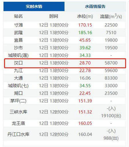 截至12日13時,長江水利網(wǎng)數(shù)據(jù)顯示,長江漢口站水位到達28.7米。這一水位超過了發(fā)生在1996年7月22日的歷史第四高水位。
