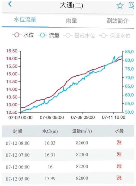 根據(jù)監(jiān)測,截至7月12日8時,受上游來水影響,長江下游重要水文站:安徽大通站流量已升至8.26萬立方米/秒,超過1998年最大流量。
