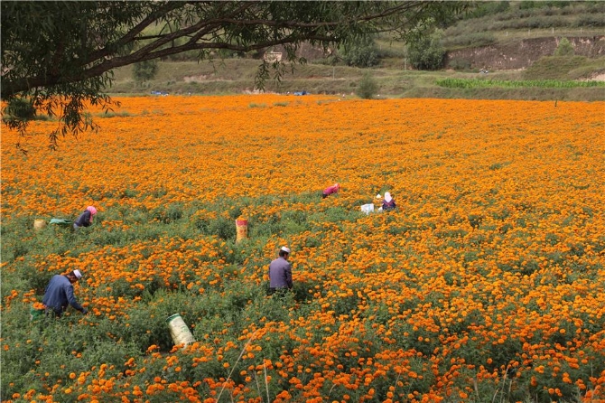 這闖的第一“關(guān)”,就是實(shí)現(xiàn)種植業(yè)的轉(zhuǎn)型。每畝地種植青貯玉米純收入是三四百元的利潤,可是聽說種萬壽菊畝均收益八九百呢。種萬壽菊可不是好玩的,別人種賺錢,咱們這些“生瓜蛋”種說不準(zhǔn)還得賠錢!面對七嘴八牙的說法,鄉(xiāng)黨委決定關(guān)口村第一步還是要嘗試種萬壽菊。咱們不行,就找“成手”來種!于是,關(guān)口村引進(jìn)一家萬壽菊專業(yè)加工企業(yè),流轉(zhuǎn)村里1800畝土地,2017年種植1400畝青貯玉米、400畝萬壽菊;2018年種植1200畝青貯玉米、600畝萬壽菊。到年底,除了每畝按100元支付土地流轉(zhuǎn)費(fèi)用,建檔立卡戶六個(gè)月在公司打工(青貯玉米),戶均收入超過1萬元,萬壽菊采摘期兩個(gè)月公司支付農(nóng)戶勞務(wù)費(fèi)就高達(dá)12萬,關(guān)口村2017年收益為34萬,2018年為43萬。