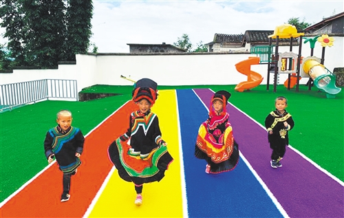 圖② 普格縣螺髻山鎮(zhèn)子熱村幼教點(diǎn)內(nèi),彝族小朋友正在操場上做游戲。 楊尚威攝(中經(jīng)視覺)
