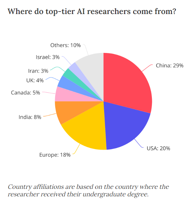 報告中的統(tǒng)計數(shù)據(jù)顯示,在美國人工智能領(lǐng)域的頂尖人才中,來自中國的人才約占三分之一。