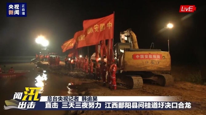 7月13日23時(shí)8分,隨著操作手駕駛推土機(jī)將最后一車土石倒入決口處,江西省鄱陽縣問桂道圩決口封堵現(xiàn)場(chǎng)響起一片歡呼聲。在搶險(xiǎn)人員連續(xù)奮戰(zhàn)83小時(shí)后,127米寬的決口成功合龍。