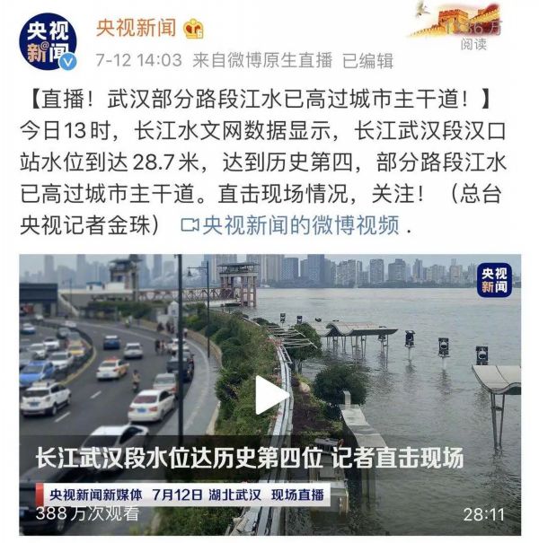 根據(jù)水利部長江水利委員會水文局實(shí)時水情監(jiān)測,長江漢口站(武漢關(guān))洪峰水位28.77米,峰現(xiàn)時間為7月12日23時,此輪洪峰水位,僅次于1954年、1998年、1999年。