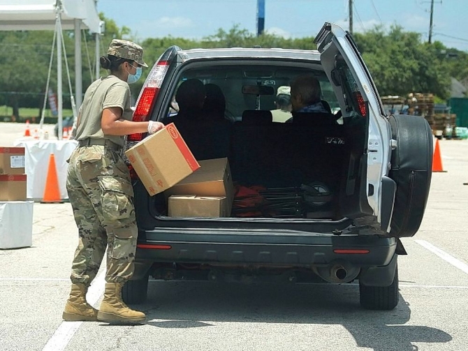 7月11日,在美國得克薩斯州休斯敦市,“食品銀行”工作人員將食物放入車輛后備廂。新華社發(fā)(勞承躍攝)