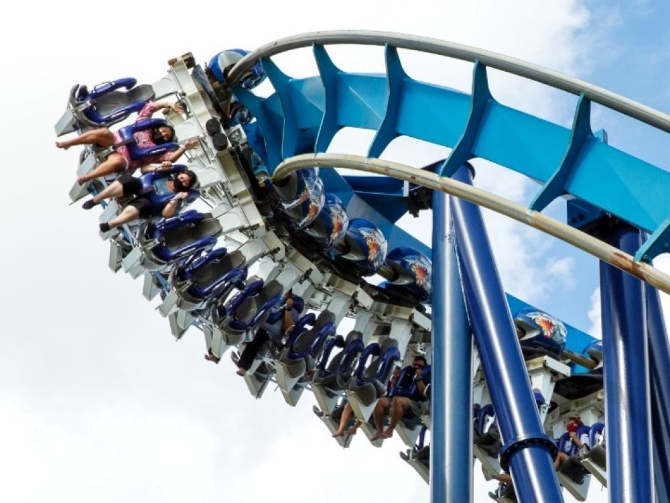 6月19日,在美國圣安東尼奧市的海洋世界主題公園,人們戴著口罩坐過山車。新華社發(fā)(馬烈攝)