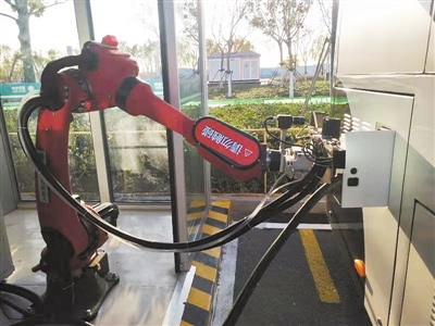 在中新友好圖書館公交站,充電機(jī)器人準(zhǔn)確識別無人公交車停靠,自動完成插槍、充電、拔槍全過程。