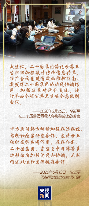 G20特別峰會(huì)上的發(fā)言《攜手抗疫 共克時(shí)艱》,第73屆世界衛(wèi)生大會(huì)視頻會(huì)議開幕式上的致辭《團(tuán)結(jié)合作戰(zhàn)勝疫情 共同構(gòu)建人類衛(wèi)生健康共同體》,中非團(tuán)結(jié)抗疫特別峰會(huì)上的主旨講話《團(tuán)結(jié)抗疫 共克時(shí)艱》,縱觀習(xí)近平主席三次國際會(huì)議的講話,團(tuán)結(jié)攜手之意貫穿始終。
