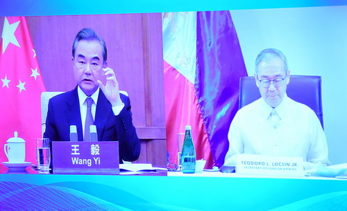 2020年7月14日,國務(wù)委員兼外長王毅同菲律賓外長洛欽舉行視頻會談。
