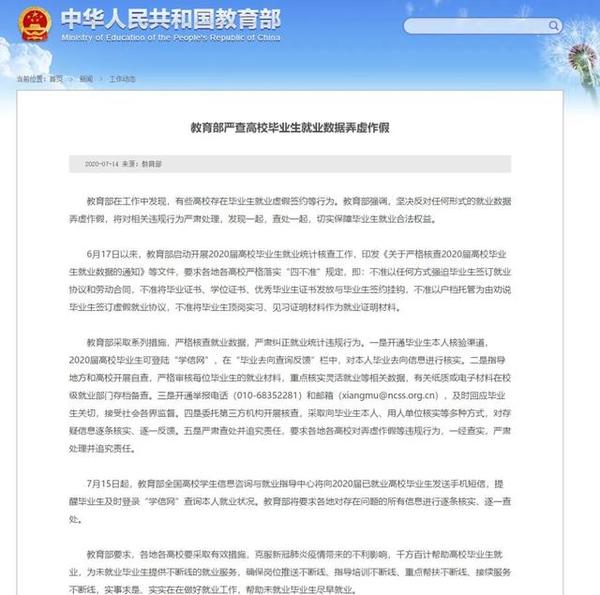 7月15日起,教育部全國高校學(xué)生信息咨詢與就業(yè)指導(dǎo)中心將向2020屆已就業(yè)高校畢業(yè)生發(fā)送手機短信,提醒畢業(yè)生及時登錄“學(xué)信網(wǎng)”查詢本人就業(yè)狀況。教育部將要求各地對存在問題的所有信息進行逐條核實、逐一查處。
