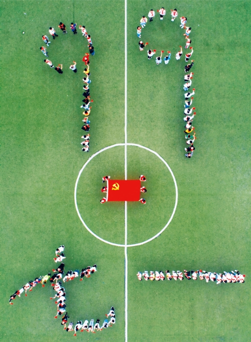 2020年6月30日,江蘇省泰州市大馮中心小學(xué)開展“童心向黨迎七一”主題班會(huì),通過給學(xué)生上黨課、講黨史等方式,讓學(xué)生了解黨的光輝歷程,迎接中國共產(chǎn)黨建黨99周年。圖為活動(dòng)中擺出的“七一”、“99”和黨旗的組合圖案。 中新社發(fā) 湯德宏/攝