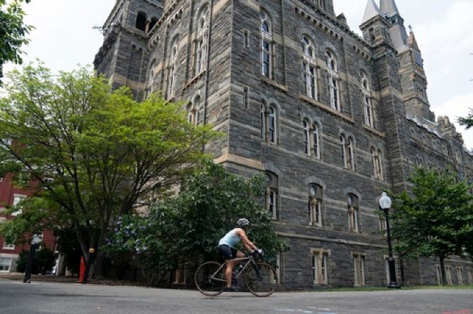 7月7日,一名女子在美國(guó)華盛頓的喬治敦大學(xué)校園內(nèi)騎自行車(chē)。新華社記者 劉杰 攝