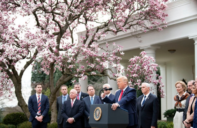 3月13日,美國(guó)總統(tǒng)特朗普(前)在華盛頓白宮發(fā)表講話時(shí)正式宣布“國(guó)家緊急狀態(tài)”。新華社記者 劉杰 攝