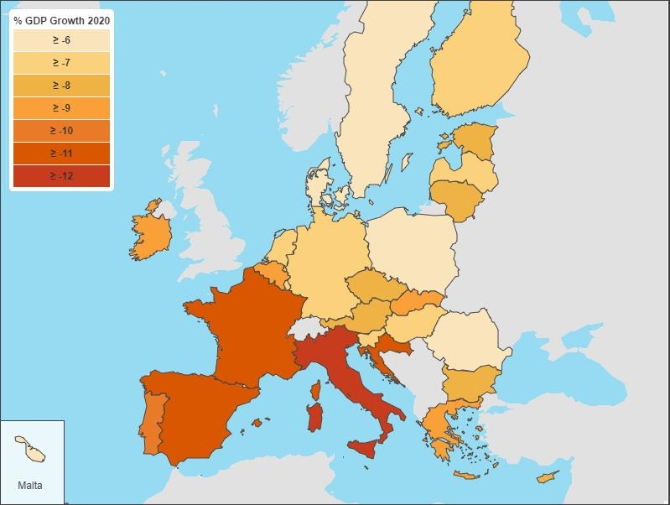 隨著歐洲疫情整體好轉(zhuǎn),各國紛紛放松封鎖,加速經(jīng)濟重啟。然而,疫情的沖擊逐漸顯現(xiàn),導(dǎo)致歐洲近期數(shù)據(jù)不容樂觀,經(jīng)濟下行壓力仍然巨大。近日,歐盟發(fā)布的夏季經(jīng)濟預(yù)測報告指出,今年歐盟經(jīng)濟將萎縮8.3%,明年的復(fù)蘇也將更加緩慢。其中,意大利形勢最為嚴(yán)峻,今年該國經(jīng)濟預(yù)計將收縮11.2%。西班牙和法國經(jīng)濟也“高臺跳水”,預(yù)計將分別下滑10.9%和10.6%。此外,脫歐后的英國經(jīng)濟也遭疫情重創(chuàng)。截至五月,全國GDP在三個月內(nèi)萎縮19.1%。英國預(yù)算責(zé)任辦公室稱,該國將面臨300年以來最大經(jīng)濟衰退。如今疫情尚未結(jié)束,局部地區(qū)出現(xiàn)反彈,這更令歐洲經(jīng)濟重啟舉步維艱。