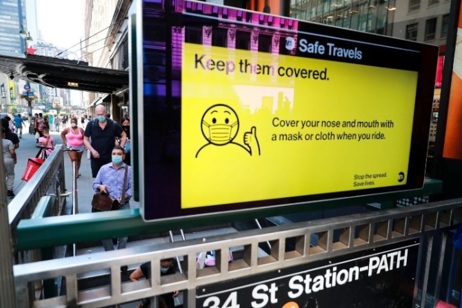 7月14日,人們佩戴口罩進入美國紐約地鐵站。新華社記者王迎攝
