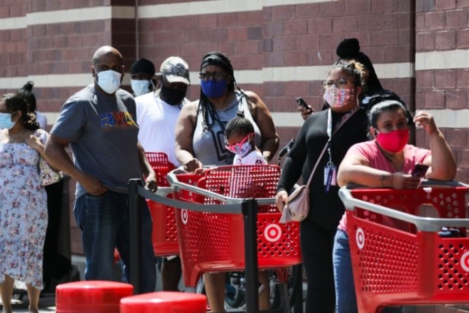 7月16日,人們在美國紐約布魯克林一家商場外排隊等待進店購物。美國約翰斯·霍普金斯大學(xué)16日發(fā)布的新冠疫情最新統(tǒng)計數(shù)據(jù)顯示,美國累計確診病例超過350萬例。新華社記者王迎攝
