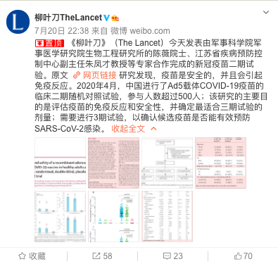 5月22日,《柳葉刀》刊發(fā)了該疫苗的Ⅰ期臨床試驗(yàn)數(shù)據(jù),也是全球第一個(gè)正式發(fā)表的新冠疫苗的人體臨床數(shù)據(jù)。試驗(yàn)結(jié)果表明,該疫苗安全性好,受試者全部產(chǎn)生抗體和細(xì)胞免疫反應(yīng)。