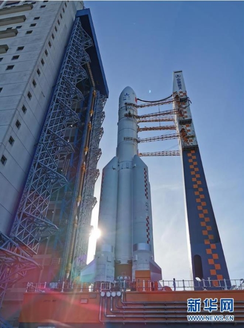 △7月17日,中國(guó)文昌航天發(fā)射場(chǎng),長(zhǎng)征五號(hào)遙四運(yùn)載火箭待命。(新華社發(fā),張高翔攝)