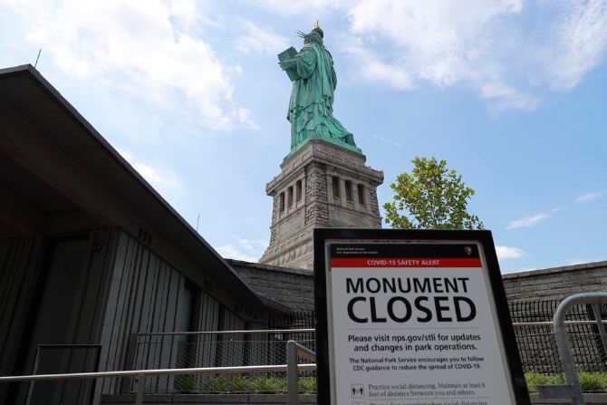 7月20日,美國(guó)紐約自由島上一處提示牌顯示自由女神像內(nèi)部的參觀仍處于暫停狀態(tài)。(新華社記者王迎攝)