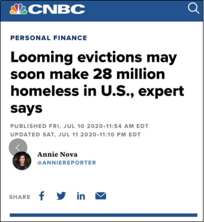 隨著一系列疫情救助措施即將到期,美國社會潛伏著的多種危機可能爆發(fā)。其中,禁止房東驅(qū)逐房客的120天臨時禁令將在7月25日到期,勢必將令許多美國家庭因交不起房租而被逐出家園??紤]到各州的暫停驅(qū)逐措施也已陸續(xù)失效,專家預(yù)計,從現(xiàn)在到今年9月,可能會有高達2800萬美國人無家可歸。與此同時,美國房客的困境可能引發(fā)連鎖反應(yīng),對房東、學(xué)區(qū)、銀行和整個房地產(chǎn)市場造成沖擊,甚至加劇新冠肺炎疫情的反彈形勢。