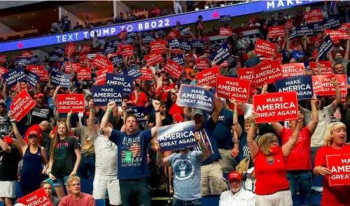 在疫情暴發(fā)后美國(guó)總統(tǒng)特朗普的首次競(jìng)選集會(huì)上,現(xiàn)場(chǎng)人群擁擠,而且大多數(shù)人都沒有佩戴口罩。