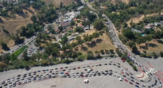 美國(guó)加利福尼亞州民眾駕車前往新冠病毒檢測(cè)處,車隊(duì)排起長(zhǎng)龍。