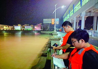 7月21日夜間,王家壩閘下測流組組長劉潤澤和安徽省水文水資源局支援人員徐潤澤在王家壩用電波流速儀測流量。時學光攝/光明圖片