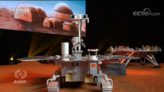 劉彤杰:“著陸平臺也叫著陸器,它和火星車加起來是1300公斤,著陸平臺載著火星車要完成進(jìn)入大氣、減速、下降、落在火星表面上,這是它最大的使命?!?/p>