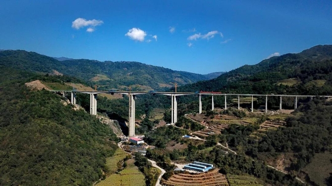 護國河特大橋位于騰沖至隴川高速公路土建2合同段K98+522處,為跨越峽谷所設(shè),谷底有河流(護國河)穿過,是項目控制性工程之一。該橋位于整體式路基的路線段上,單幅橋?qū)挒?2.5米,橋跨布置為左、右幅,橋梁左、右幅全長1021.5米(含橋臺)。橋位處地勢起伏,呈U形,谷底距橋面最大深度約160米,5號主墩高147米,目前為省內(nèi)建成同類型橋梁最高墩柱。工程于2020年1月10日完成主跨合攏。