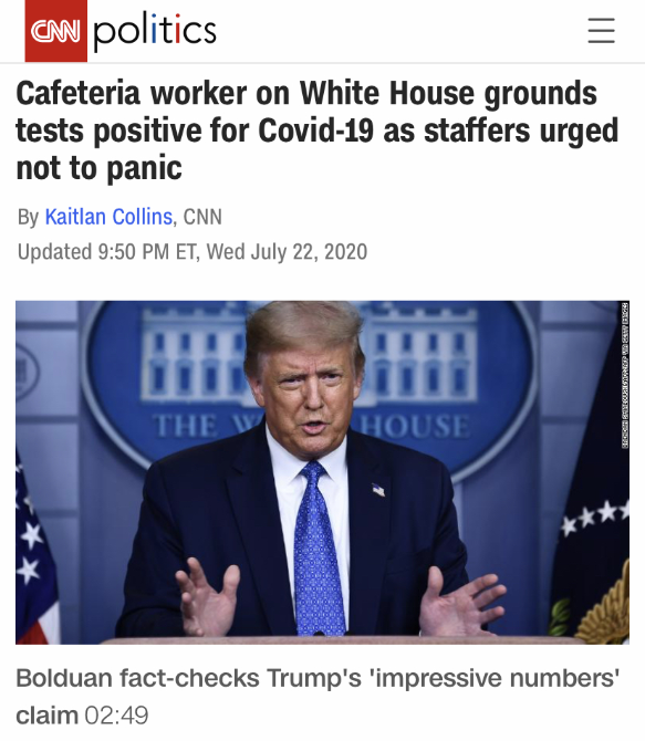 CNN稱,一名白宮雇員日前確診新冠肺炎,其他工作人員試圖平息恐慌