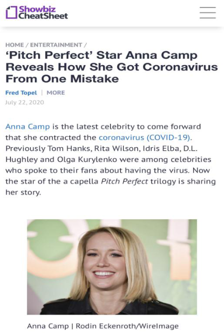 7月21日,曾出演音樂喜劇電影《完美音調(diào)》的好萊塢明星安娜·坎普公開宣布感染新冠病毒。她表示,自己曾因僥幸心理在公共場所摘下口罩,并因此感染。對于治療的過程,她說:“人們總說新冠病毒和普通感冒病毒一樣,但其實(shí)并非如此。它會(huì)使人完全失去嗅覺和味覺,還會(huì)造成眩暈、疲乏、腹痛、嘔吐和高燒等癥狀?!蓖ㄟ^講述個(gè)人經(jīng)歷,坎普呼吁民眾不要對新冠病毒掉以輕心,務(wù)必堅(jiān)持在公共場所佩戴口罩。