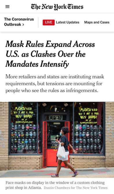 《紐約時(shí)報(bào)》稱,盡管對于口罩的接受度逐漸上升,但對于政府能否強(qiáng)制民眾佩戴口罩仍有爭議
