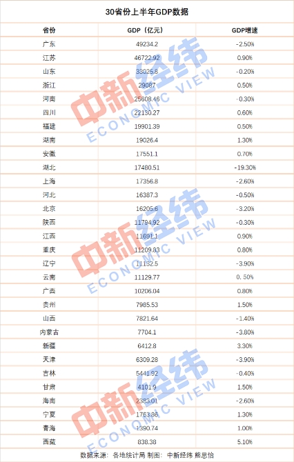 對(duì)比一季度經(jīng)濟(jì)運(yùn)行數(shù)據(jù),30省份經(jīng)濟(jì)均出現(xiàn)不同程度反彈。湖北、新疆、重慶、安徽、河南、吉林、浙江等省份經(jīng)濟(jì)反彈最為明顯,上半年GDP增速較一季度提升均在6個(gè)百分點(diǎn)以上。