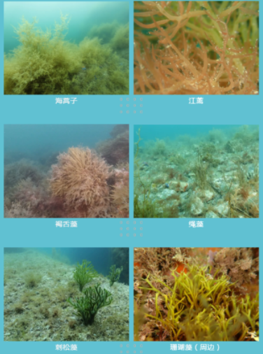 此次水下調(diào)查顯示,潮連島南北兩側(cè)水深10米之淺的海域均分布有較大面積的密集海藻場(chǎng)。島體北側(cè)海藻場(chǎng)主要分布于巖礁海底,海藻密集分布區(qū)域面積約0.07平方千米;南側(cè)海藻場(chǎng)主要分布于礁巖海底和砂質(zhì)海底,海藻密集分布區(qū)域面積約0.15平方千米,海底海藻平均覆蓋度達(dá)90%以上,密集區(qū)海藻濕重生物量可達(dá)4千克/平方米。主要類群為紅藻和褐藻,支撐藻種為海蒿子,其他常見(jiàn)種類包括江蘺、裙帶菜、繩藻、石花菜、珊瑚藻、石莼、褐舌藻、刺松藻、金膜藻、美麗異管藻和網(wǎng)地藻等。
