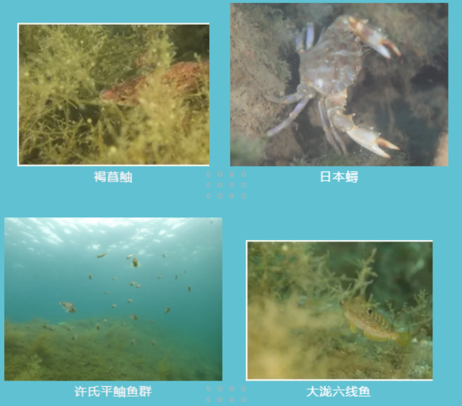通過(guò)水下觀測(cè)發(fā)現(xiàn),海藻場(chǎng)中棲息著許氏平鲉、褐菖鲉、牙鲆、條石鯛、裸平鲉、花斑平鲉、馬面鲀、日本蟳、脈紅螺、皺紋盤(pán)鮑、仿刺參、沙海蜇等十余種經(jīng)濟(jì)海洋生物。