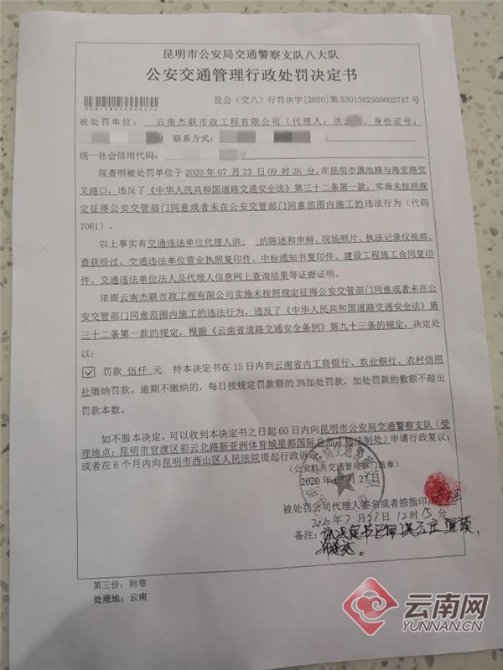 經(jīng)調(diào)查證實,施工方為云南杰聯(lián)市政工程有限公司,施工項目為滇池路度假區(qū)道路及其附屬設(shè)施提升改造工程,施工方在圍擋占用道路施工影響交通通行時,并未征得公安交通管理部門的同意。