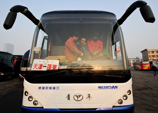 2013年1月18日,天津市交通集團(tuán)的工作人員在為長(zhǎng)途客車安裝“北斗”導(dǎo)航終端。新華社記者 張超群 攝