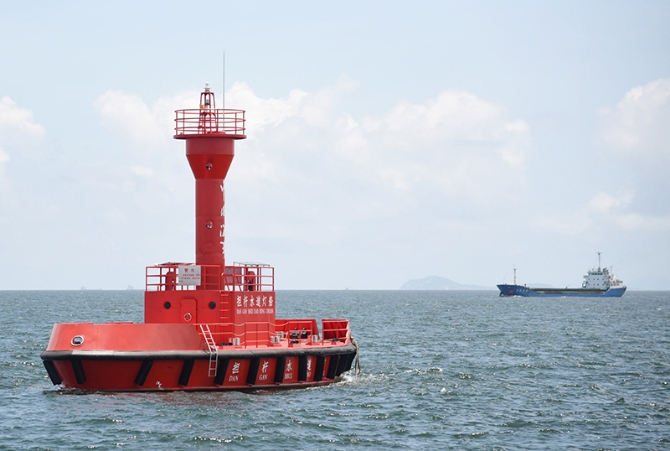 采用北斗航標(biāo)遙測(cè)遙控裝置的一艘大型燈船投放在珠江口擔(dān)桿水道(2019年6月20日攝)。新華社記者 田建川 攝