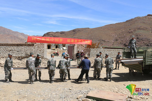 盛夏的日光里,這個(gè)海拔4000米之上的村落繁忙起來(lái),裝有建筑物料的大卡車(chē)開(kāi)進(jìn)了村,部隊(duì)官兵將鋼筋抬到院子里,村民正在堆放砂石和水泥。按照普夏村軍地扶貧的規(guī)劃,村里的第一個(gè)藏雞養(yǎng)殖場(chǎng)正在建設(shè)。
