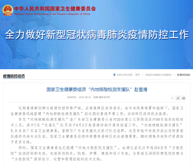 首支“內(nèi)地核酸檢測(cè)支援隊(duì)”由廣東省衛(wèi)生健康委從省內(nèi)20余家公立醫(yī)院選派約60名臨床檢驗(yàn)技術(shù)人員,其中7名“先遣隊(duì)”隊(duì)員將于8月2日赴香港協(xié)助開展實(shí)驗(yàn)室工作?!皟?nèi)地核酸檢測(cè)支援隊(duì)”隊(duì)長(zhǎng)來(lái)自廣東省衛(wèi)生健康委,曾擔(dān)任廣東省支援武漢醫(yī)療隊(duì)總指揮,這是首批中央政府派出支持香港抗疫的內(nèi)地專業(yè)隊(duì)伍。國(guó)家衛(wèi)生健康委后續(xù)將根據(jù)香港特區(qū)抗擊疫情需要,隨時(shí)調(diào)集內(nèi)地醫(yī)療資源給予更多支持。