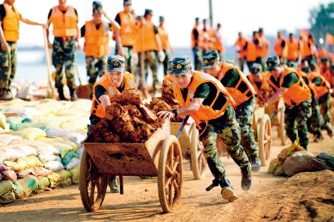 2020年7月以來,我國(guó)多地遭遇持續(xù)強(qiáng)降雨,發(fā)生嚴(yán)重洪澇災(zāi)害。人民至上、生命至上。提前轉(zhuǎn)移、緊急營(yíng)救、妥善安置……一場(chǎng)涉及上百萬群眾生命的生死競(jìng)速就此拉開。圖為2020年7月17日,武警江西總隊(duì)機(jī)動(dòng)支隊(duì)黨員突擊隊(duì)在江西省鄱陽(yáng)縣鄱陽(yáng)鎮(zhèn)昌江圩用推車將余土推到空地堆放。 新華社發(fā) 曹先訓(xùn)/攝