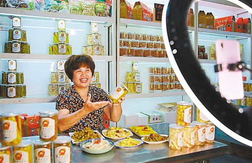 黃沙村華屋村民“華嬤嬤”泡菜創(chuàng)始人華小英在她的泡菜坊直播帶貨。隨著當(dāng)?shù)丶t色旅游的發(fā)展,“華嬤嬤”泡菜成為熱銷品,銷往全國各地。