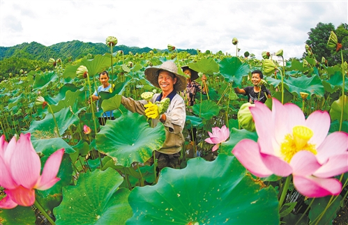 黃沙村華屋蓮農(nóng)在采摘蓮蓬。當(dāng)?shù)亟Y(jié)合鄉(xiāng)村旅游發(fā)展白蓮產(chǎn)業(yè),帶動農(nóng)戶在家門口就業(yè)。
