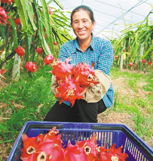 黃沙村華屋果蔬基地,果農(nóng)在采摘火龍果。目前,當(dāng)?shù)胤N植火龍果、葡萄等瓜果200余畝。