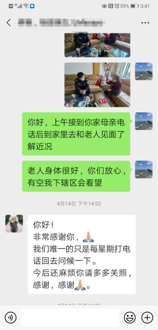 疫情期間,面對(duì)嚴(yán)峻地疫情防控形勢,口罩十分稀缺、一“罩”難求,朱雪峰第一時(shí)間想到楊阿姨。2月9日,元宵節(jié)的后一天,他趕緊給楊阿姨送去防護(hù)口罩,叮囑楊阿姨在疫情防控的關(guān)鍵時(shí)期出門一定要戴口罩,做好自身防護(hù),勤洗手多通風(fēng)。期間,朱雪峰多次和楊阿姨保持通信聯(lián)系,時(shí)常上門走訪,了解楊阿姨生活中的困難和需求,竭盡全力為其解決,并保持和楊阿姨女兒的日常溝通,讓子女放心。